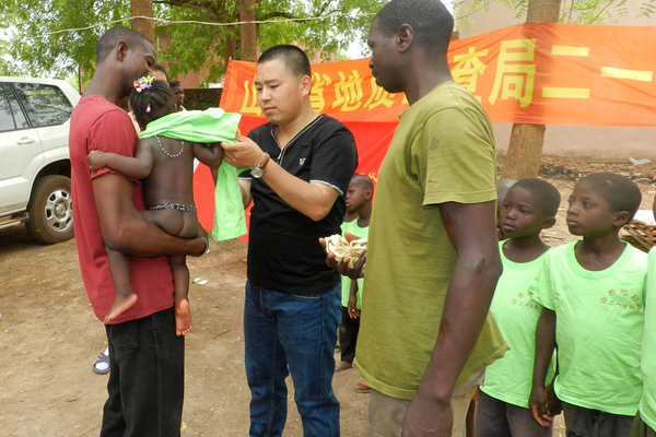 5月6日在非洲馬里DOGO,217隊(duì)馬里金礦項(xiàng)目組在駐地為當(dāng)?shù)卮迕衽e辦了“送清涼 獻(xiàn)愛心”活動(dòng),聞?dòng)嵡皝淼娜硕細(xì)g欣鼓舞、喜不自勝。