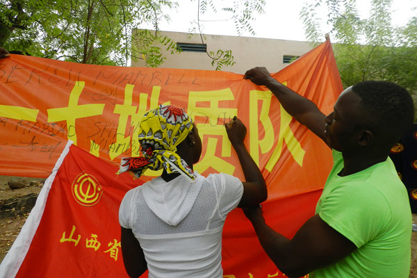 活動(dòng)中孩子們穿著合身的衣服,背著嶄新的書包歡呼雀躍。他們把我隊(duì)項(xiàng)目組的小伙子們緊緊圍繞,問長問短,歡聲笑語不斷從小院傳至DOGO鄉(xiāng)村的角角落落。禮品贈(zèng)送完畢,大家又進(jìn)行了簽名活動(dòng),無論大人還是孩子,無論會(huì)不會(huì)寫字都留下了屬于自己的痕跡。整個(gè)村莊沉浸在喜氣洋洋、快樂祥和的氣氛中。